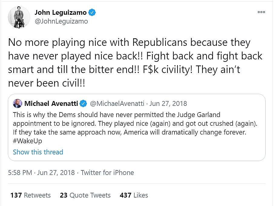 Back in June 2018, he wrote on Twitter, “No more playing nice with Republicans because they have never played nice back!! Fight back and fight back smart and till the bitter end!! F$k civility! They ain’t never been civil!!”