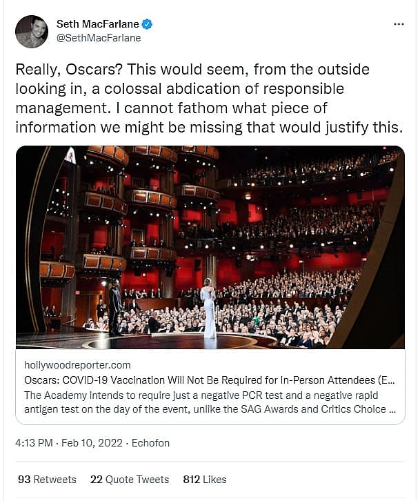 What do you make of MacFarlane’s response to this report that the Oscars might not require vaccines for attendance?