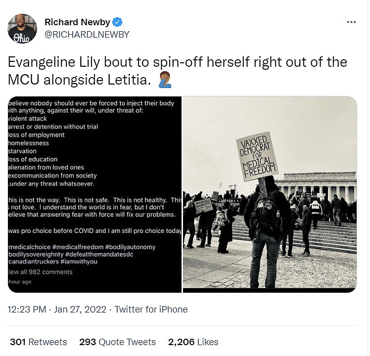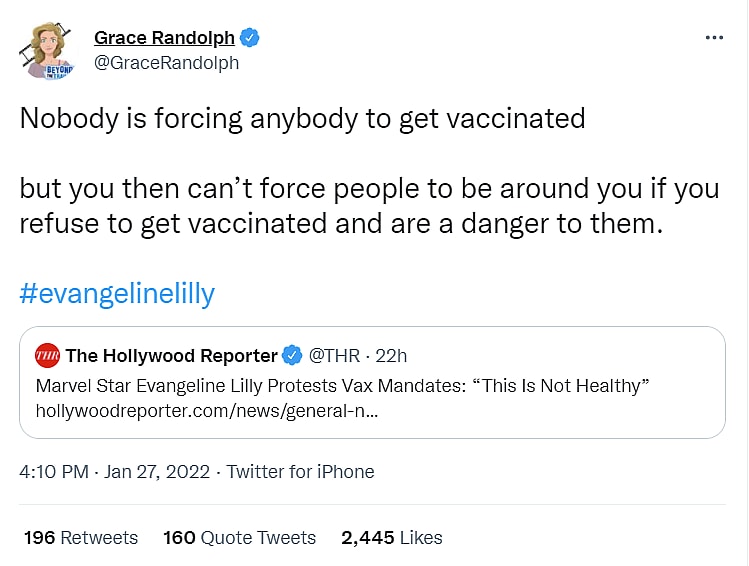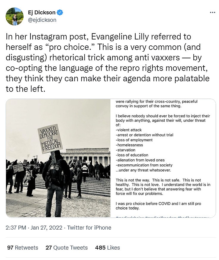 Rolling Stone writer Ej Dickson tweeted, “In her Instagram post, Evangeline Lilly referred to herself as ‘pro choice.’ This is a very common (and disgusting) rhetorical trick among anti vaxxers — by co-opting the language of the repro rights movement, they think they can make their agenda more palatable to the left.”