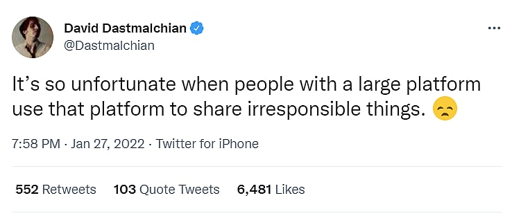 In an apparent response to this Instagram post from Lilly, Dastmalchian took to Twitter where he wrote, “It’s so unfortunate when people with a large platform use that platform to share irresponsible things.”