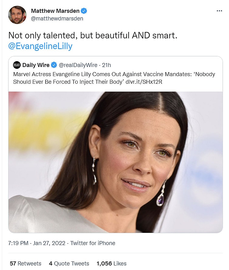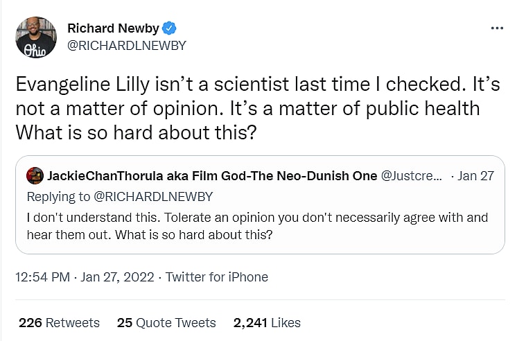 He added in another tweet, “Evangeline Lilly isn’t a scientist last time I checked. It’s not a matter of opinion. It’s a matter of public health What is so hard about this?”