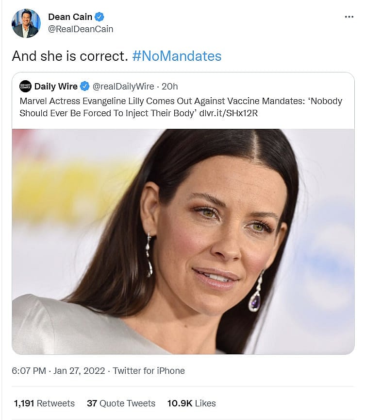 Lois & Clark: The New Adventures of Superman actor Dean Cain tweeted, “And she is correct. #NoMandates“