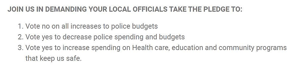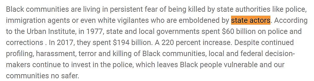 It then adds, “Despite continued profiling, harassment, terror and killing of Black communities, local and federal decision-makers continue to invest in the police, which leaves Black people vulnerable and our communities no safer.”