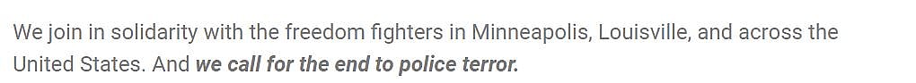 The petition then closes out reading, “We join in solidarity with the freedom fighters in Minneapolis, Louisville, and across the United States. And we call for the end to police terror.”