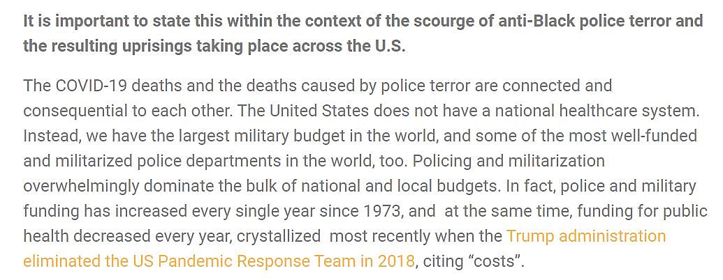 “Policing and militarization overwhelmingly dominate the bulk of national and local budgets. In fact, police and military funding has increased every single year since 1973, and at the same time, funding for public health decreased every year, crystallized most recently when the Trump administration eliminated the US Pandemic Response Team in 2018, citing “costs”,” it adds.