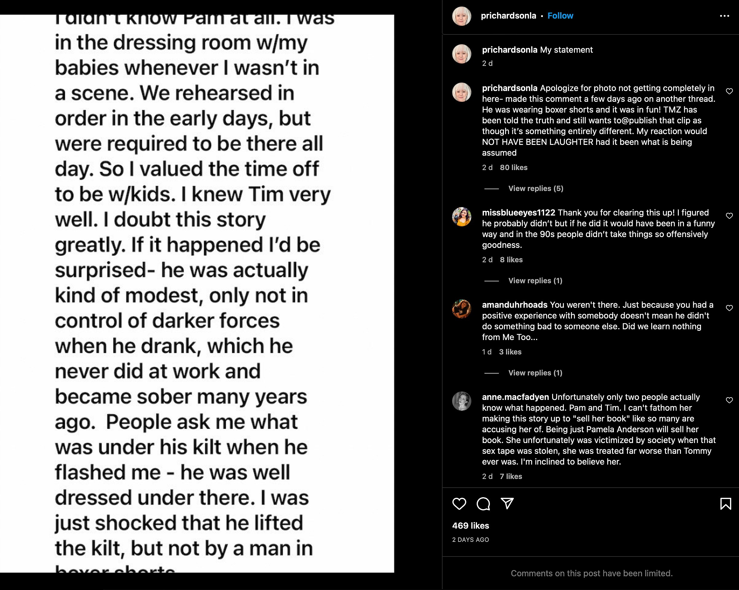 Weighing in on the situation on Instagram, Allen’s Home Improvement co-star Patricia Richardson, who portrayed his on-screen screen wife on the show, opined, “I don’t know Pam at all. I knew Tim very well. I doubt this story greatly.”