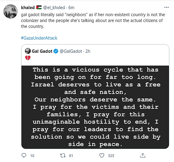 One wrote, “gal gadot literally said ‘neighbors’ as if her non-existent country is not the colonizer and the people she’s talking about are not the actual citizens of the country.”