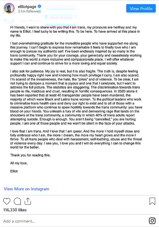 Page revealed his newly accepted identity in a December 1st Instagram post, informing his followers “that I am trans, my pronouns are he/they and my name is Elliot” and noting how he feels “lucky to be writing this. To be here. To have arrived at this place in my life.”