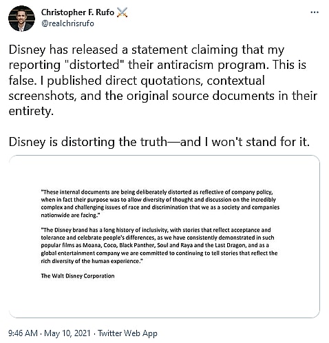 Unsurprisingly, Disney did not take kindly to their internal documents being exposed, issuing a statement four days after Rufo’s initial reporting claiming that “these internal documents are being deliberately distorted as reflective of company policy.”