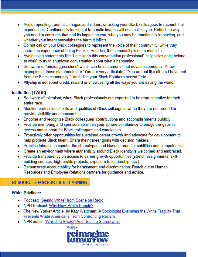 Ironically, Disney also asks institutions to both “be aware of tokenism, when Black professionals are expected to be representative for their entire race” and “mention professional skills and qualities of Black colleagues when they are not around to provide visibility and sponsorship,” not realizing that the latter request is literally tokenization.