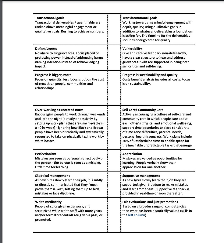 This includes pivoting from such norms as “individualism & seperateness”, “priorities and timelines that perpetuate white supremacy culture”, and “superiority of the nonprofit written word” to “community and collectivism”, “priorities and timelines set for sustainability and equity”, and “all forms of communication valued and taken seriously”, respectively.