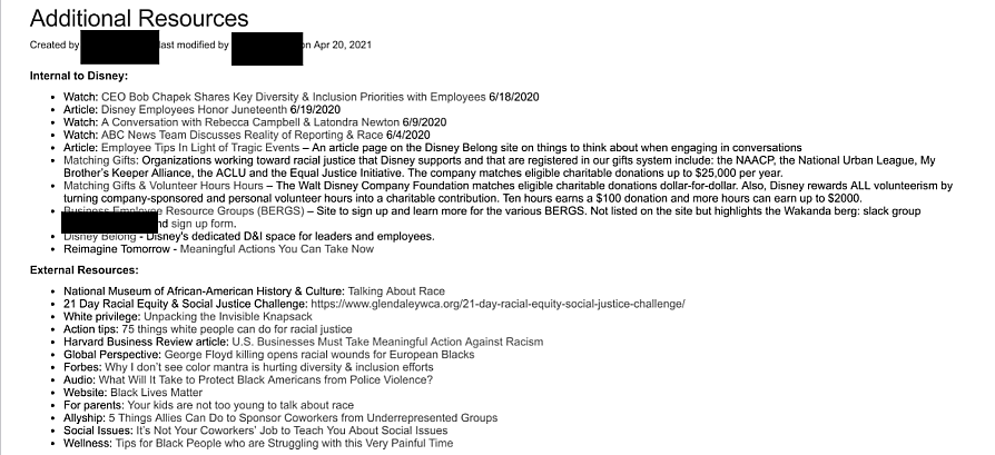 Instead, claimed Disney, “their purpose was to allow diversity of thought and discussions on the incredibly complex and challenging issues of race and discrimination that we as a society and companies nationwide are facing.”