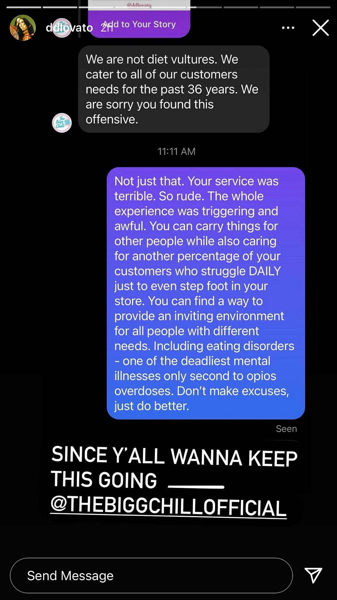 The people over at The Bigg Chill did not stand for Lovato’s accusations, writing “We are not diet vultures” in reply to Lovato via Instagram’s Direct Messenger.