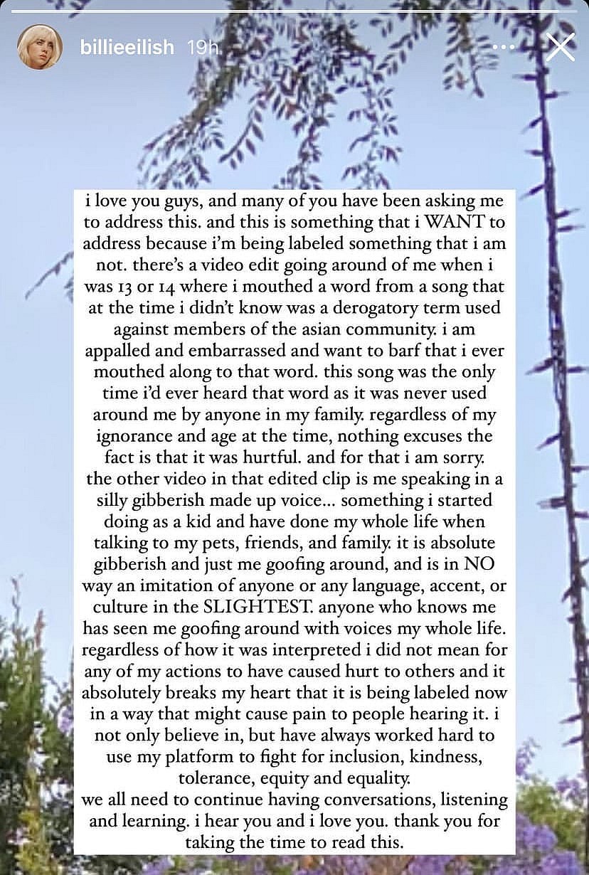 “i love you guys, and many of you have been asking me to address this. and this is something that i WANT to address because I’m being labeled something that i am not,” wrote Eilish in a now-expired Instagram story. “There’s a video edit going around of me when i was 13 or 14 where i mouthed a word from a song that at the time i didn’t know was a derogatory term used against members of the asian community.”