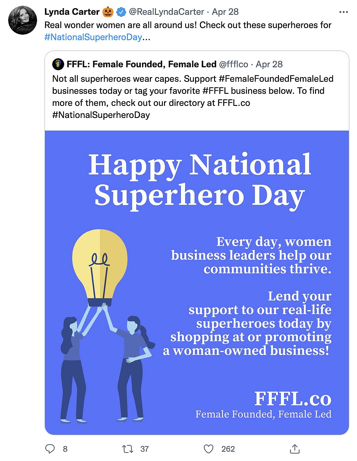 “Real wonder women are all around us! Check out these superheroes for #NationalSuperheroDay,” wrote Carter whilst sharing a tweet from the organisation made in support of businesses founded exclusively by women.