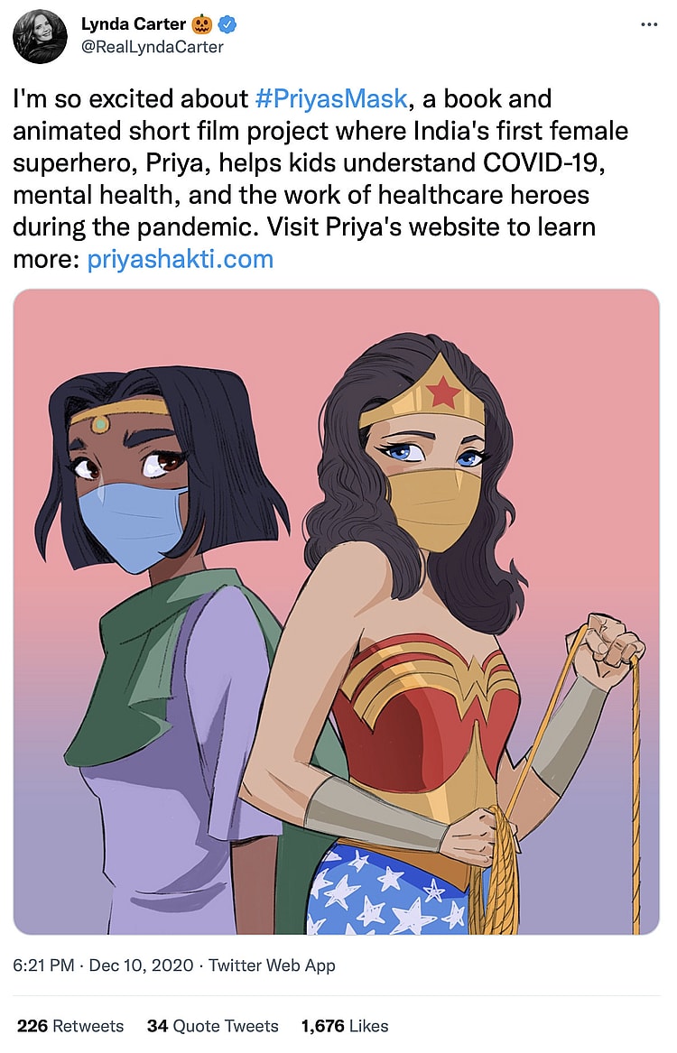 “I’m so excited about #PriyasMask, a book and animated short film project where India’s first female superhero, Priya, helps kids understand COVID-19, mental health, and the work of healthcare heroes during the pandemic,” wrote Carter.