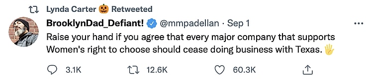 Following the passing of the Texas Heartbeat Act (SB 8), Lynda Carter shared a tweet by infamous left-wing activist BrooklynDad_Defiant, in which he stated, “Raise your hand if you agree that every major company that supports Women’s right to choose should cease doing business with Texas.”