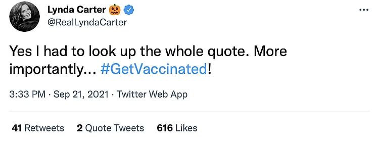 In a follow-up tweet, Carter wrote, “Yes I had to look up the whole quote. More importantly… #GetVaccinated!”