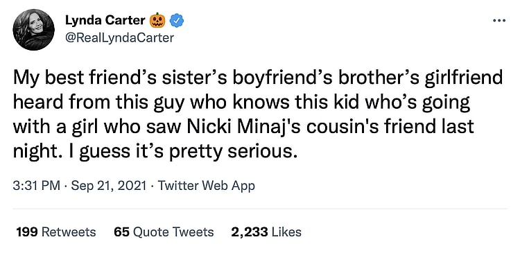Mockingly quoting Ferris Bueller’s Day Off in response to rapper Nicki Minaj’s legitimate concerns regarding COVID-19 vaccinations, Carter wrote back in September, “My best friend’s sister’s boyfriend’s brother’s girlfriend heard from this guy who knows this kid who’s going with a girl who saw Nicki Minaj’s cousin’s friend last night. I guess it’s pretty serious.”