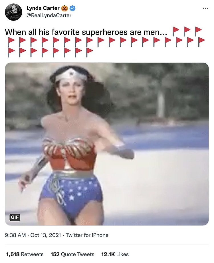 “When all his favorite superheroes are men…”, she tweeted on October 13th, driving her point home with a GIF of herself as Wonder Woman.
