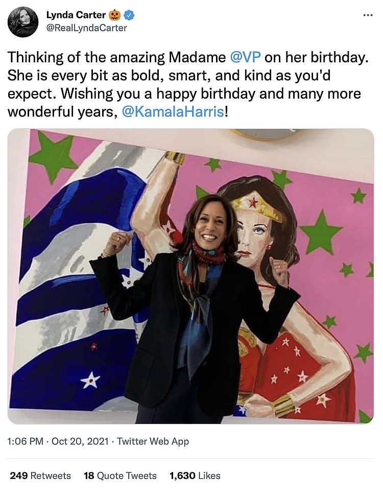 She did wish Kamala Harris a happy birthday, though, sharing an image of the Democrat Vice President and heavily implying that she represents the values and morals that Wonder Woman stands for.