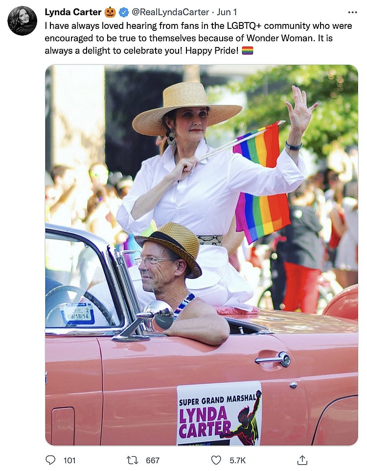 “I have always loved hearing from fans in the LGBTQ+ community who were encouraged to be true to themselves because of Wonder Woman,” wrote Carter at the beginning of Pride Month in June. “It is always a delight to celebrate you! Happy Pride!”