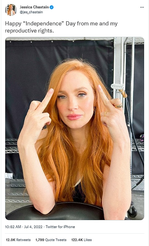 Chastain wrote on Twitter, “Happy ‘Independence’ Day from me and my reproductive rights.”