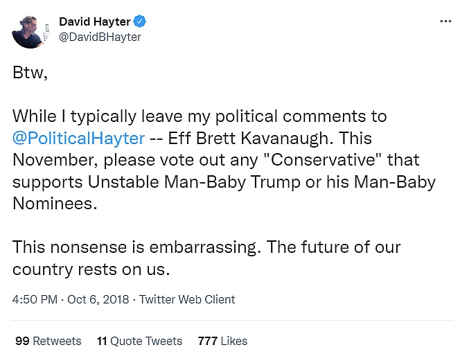 In 2018, he tweeted, “While I typically leave my political comments to @PoliticalHayter — Eff Brett Kavanaugh. This November, please vote out any ‘Conservative’ that supports Unstable Man-Baby Trump or his Man-Baby Nominees.”