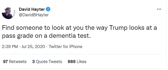 In July 2020, he wrote, “Find someone to look at you the way Trump looks at a pass grade on a dementia test.”