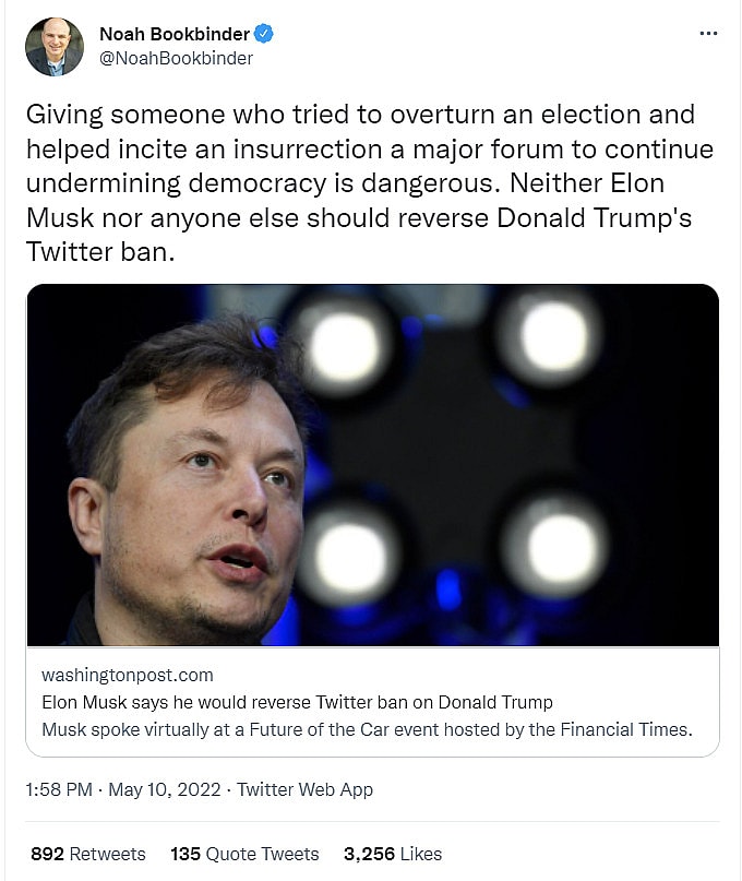 When asked to clarify if he will allow Trump back on Twitter, Musk answered, “He has publicly stated that he will not be coming back to Twitter, and that he will only be on Truth Social. And this is the point that I’m trying to make, which is perhaps not getting across, is that banning Trump from Twitter didn’t end Trump’s voice. It will amplify it among the right and this is why it is morally wrong and flat out stupid.”