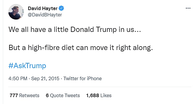 Hayter has made his dislike for President Donald Trump well known. Back in September 2015, he tweeted, “We all have a little Donald Trump in us… But a high-fibre diet can move it right along.”