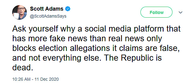 In response to this removal, Adams called on his followers to “ask yourself why a social media platform that has more fake news than real news only blocks election allegations it claims are false, and not everything else.”