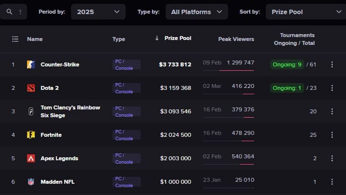 Dota 2 had a prize pot of over $40 million, maintaining its dominance as the most valuable esports championship. It was closely followed by PGL, which had $25 million, and League of Legends World Championship 2024, with $20 million.