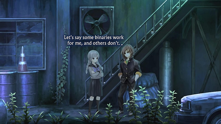In an official screenshot from the English release of the game, Okino states that he crossdresses because “some binaries work for me, and others don’t.”