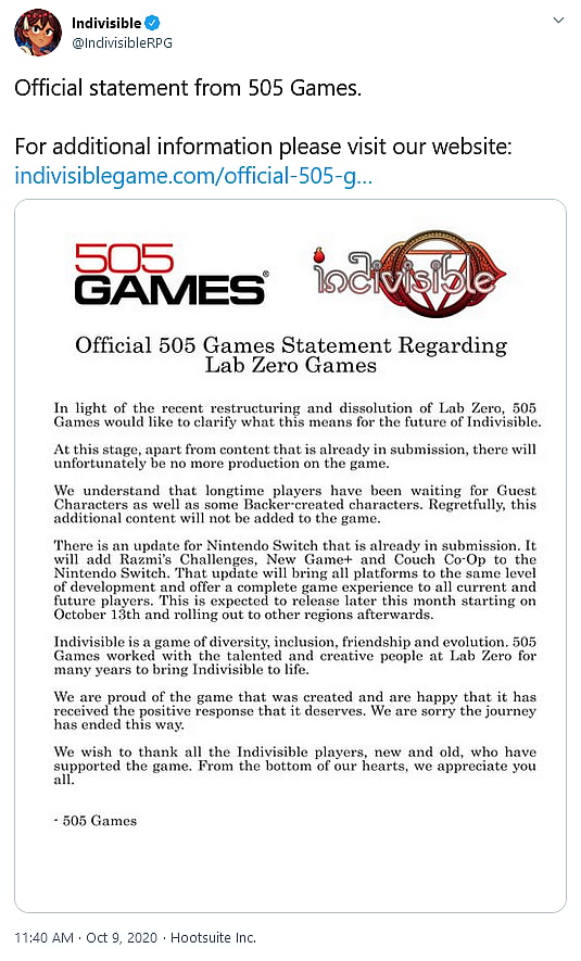 505 Games concluded their statement by noting that “Indivisible is a game of diversity, inclusion, friendship, and evolution,” and apologized to their fans for the fact that “the journey has ended this way.”