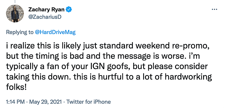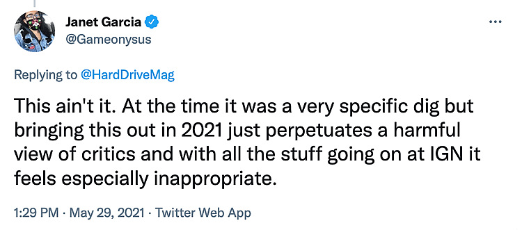 “This ain’t it,” similarly declared former IGN writer Janet Garcia, adding, “At the time it was a very specific dig but bringing this out in 2021 just perpetuates a harmful view of critics and with all the stuff going on at IGN it feels especially inappropriate”.