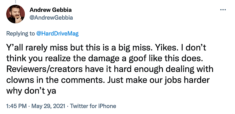“I don’t think you realize the damage a goof like this does,” said Gebbia. “Reviewers/creators have it hard enough dealing with clowns in the comments. Just make our jobs harder why don’t ya”.