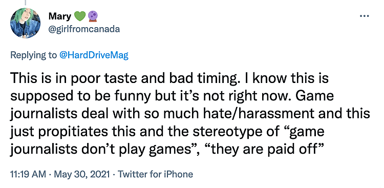 “I know this is supposed to be funny but it’s not right now,” she continued. “Game journalists deal with so much hate/harassment and this just propitiates this and the stereotype of ‘game journalists don’t play games’, ‘they are paid off'”.