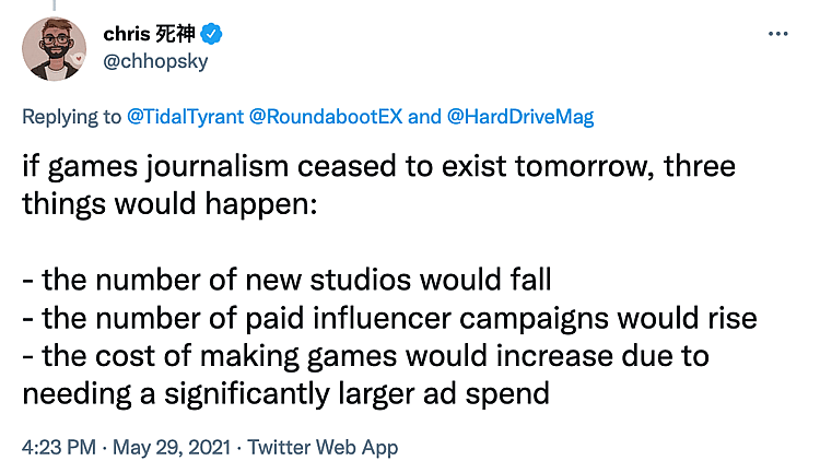 According to Dauntless programmer and former Proving Grounds contributor Chris Pollock, “if games journalism ceased to exist tomorrow, three things would happen: the number of new studios would fall, the number of paid influencer campaigns would rise, [and] the cost of making games would increase due to needing a significantly larger ad spend.”