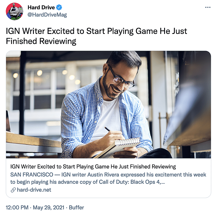 The outrage began on May 29th, 2021 when Hard Drive, a satirical news site in the vein of The Onion or The Babylon Bee whose content focuses exclusively on video games, tweeted a link to their article, “IGN Writer Excited to Start Playing Game He Just Finished Reviewing” from their official Twitter account.