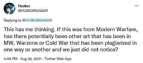 In conclusion to his thoughts on Activision’s apparent plagiarism, @HUSK3RGAM3R asked, “If this was from Modern Warfare, has there potentially been other art that has been in MW, Warzone or Cold War that has been plagiarized in one way or another and we just did not notice?”