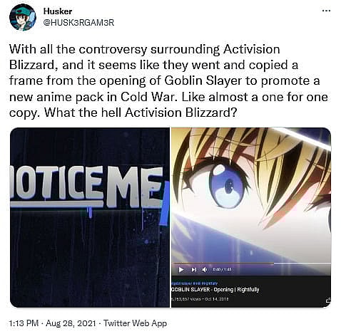 “With all the controversy surrounding Activision Blizzard, and it seems like they went and copied a frame from the opening of Goblin Slayer to promote a new anime pack in Cold War,” wrote @HUSK3RGAM3R. “Like almost a one for one copy. What the hell Activision Blizzard?”