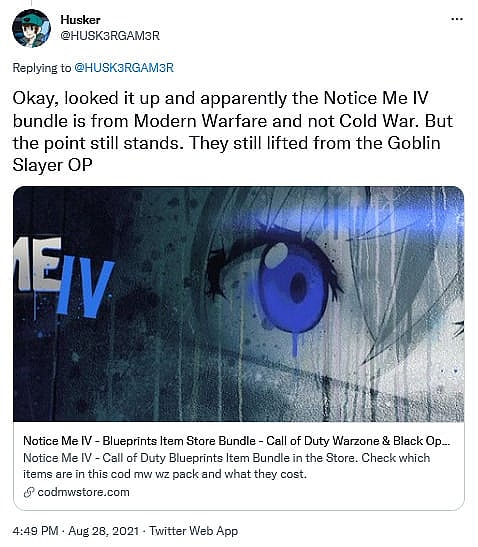“Okay, looked it up and apparently the Notice Me IV bundle is from Modern Warfare [the engine upon which Warzone was built] and not Cold War,” the streamer corrected himself in a follow-up tweet. “But the point still stands. They still lifted from the Goblin Slayer OP.”