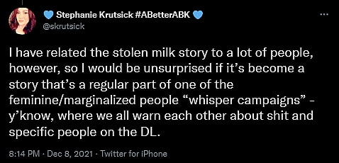 Ultimately, after detailing further personal maternity-related anecdotes from her time at Blizzard, Krutsick concluded, “I have related the stolen milk story to a lot of people, however, so I would be unsurprised if it’s become a story that’s a regular part of one of the feminine/marginalized people “whisper campaigns” – y’know, where we all warn each other about s*** and specific people on the DL.”