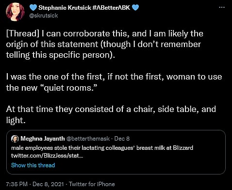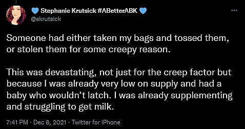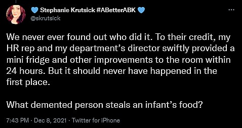 “One day, I went to retrieve my pumped supply at the end of the day and it was gone,” she continued. “There were no other mothers in the building, & very few women at all in either QA or CS at the time. All the other items I had seen earlier were still in the fridge. They were dated and labeled.”