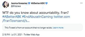 Blizzard test analyst Jessica Gonzalez was also blocked after she questioned, “WTF do you know about accountability, Fran?”