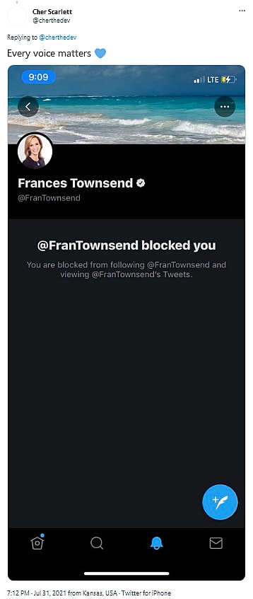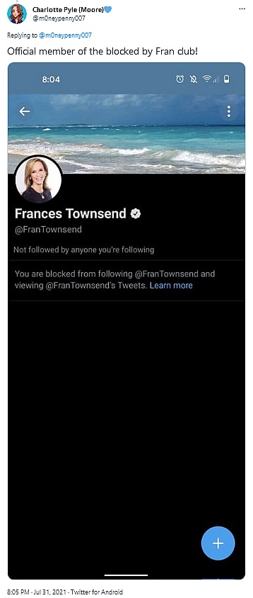 Pyle claims she was was blocked after criticizing Townsend and her sharing of the anti-whistleblower article. She wrote about Townsend, “she is either ridiculously incompetent or perhaps this is an intimidation tactic.”