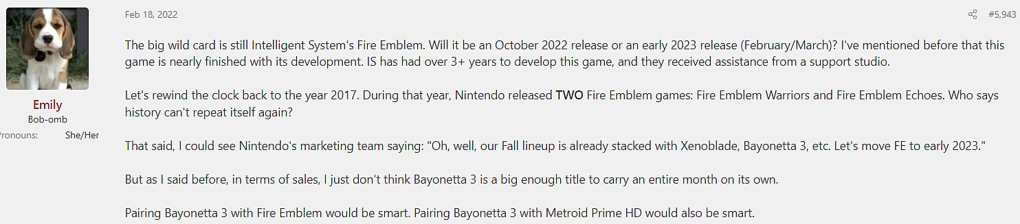 At the time, in discussion of Nintendo’s 2022 plans, Rogers told the Famiboards forum that “The big wild card is still Intelligent System’s Fire Emblem.”