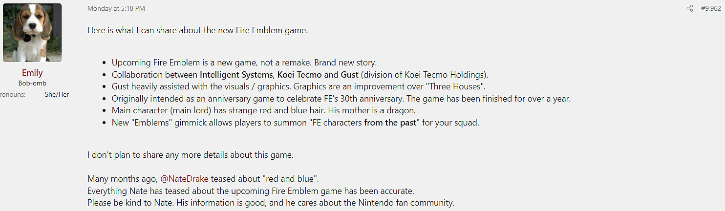 Fast-forwarding to June 13th, Rogers later returned to Famiboards to provide users with an update on “the new Fire Emblem Game”.