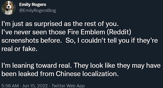 “I’ve never seen those Fire Emblem (Reddit) screenshots before,” she said. “So, I couldn’t tell you if they’re real or fake. I’m leaning toward real. They look like they may have been leaked from Chinese localization.”